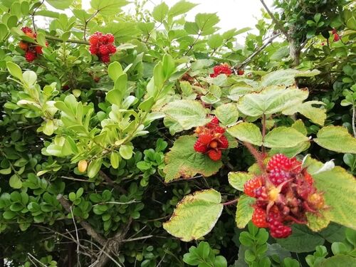 交差点で信号待ちするちょっとの間も日陰を探さずにはいられない暑さ。お店の駐車場の角の植え込みの陰に立って、ふと振り向くと ラズベリー? ラズベリーは灌木ってイメージだけど、これは高さが2メートル以上ある。 木苺は種類が多いらしいから、ラズベリ…